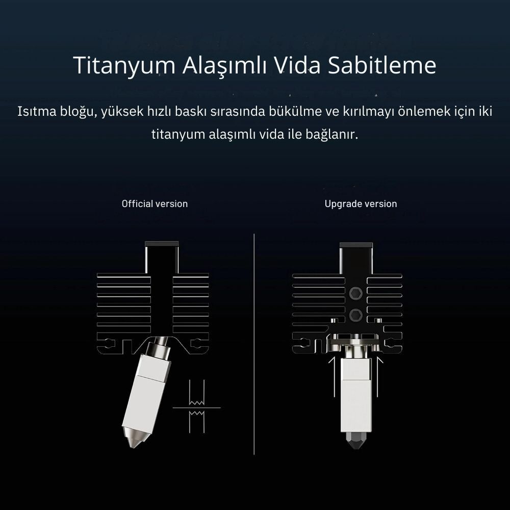 Bu kit ile birlikte 320°C kadar ısıtabilirsiniz. Titanyum alaşımlı vida sabitleme sayesinde bükülme ve kırılmayı önceleyebilirsiniz. Bu kit farklı boyutlarda nozzle değişimine olanacak sağlar. Montajı da çok kolaydır.