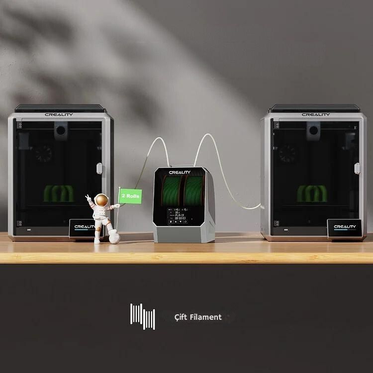 Creality Space Pi Filament Dryer, 3D yazıcı filamentlerini nemden koruyarak daha iyi baskı sonuçları elde etmeye yardımcı olan bir cihazdır. Filamentlerin nem alması, baskı sırasında problemlere ve düşük kaliteli sonuçlara yol açabilir. Bu cihaz, filamentleri belirli bir sıcaklık ve nem seviyesinde tutarak, filamentin bozulmasını önler ve daha stabil ve kaliteli baskılar yapılmasını sağlar. Böylece 3D yazıcı kullanıcıları, filamentlerin en iyi durumda kalmasını sağlayarak daha güvenilir baskı süreçleri gerçekleştirebilir. DB-04 ürünü çift filament kurutmaktadır.