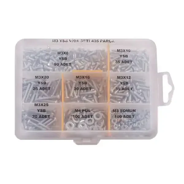 Projelerde sıkça ihtiyaç duyulan M3 ve farklı uzunluklara sahipyıldız silindir başlı metrik vida ve vidaya uyumlu somun-pul setidir. Üzerinde malzeme isimleri yazan etiketler ile plastik kutu kaybolmaları, karışmaları önler.