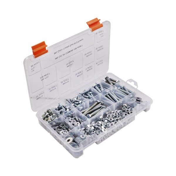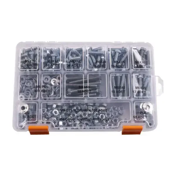 Projelerde sıkça ihtiyaç duyulan M6 ve farklı uzunluklara sahip anahtar başlı metrik vida ve vidaya uyumlu somun-pul setidir. Üzerinde malzeme isimleri yazan etiketler ile plastik kutu kaybolmaları, karışmaları önler.
