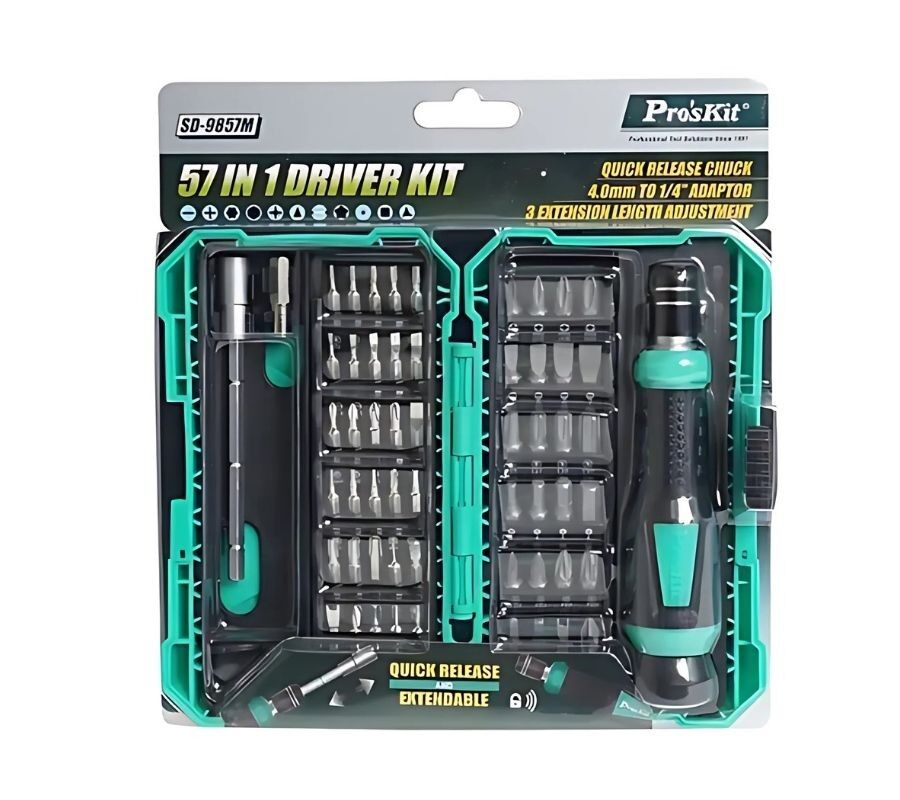 Proskit SD-9857M 57 Parça Hassas Tornavida Seti, hassas işler için tasarlanmış, kaliteli ve dayanıklı bir tornavida setidir. Özellikle elektronik cihaz tamiri, bilgisayar, cep telefonu gibi hassas ekipmanlarla çalışmak için uygundur.